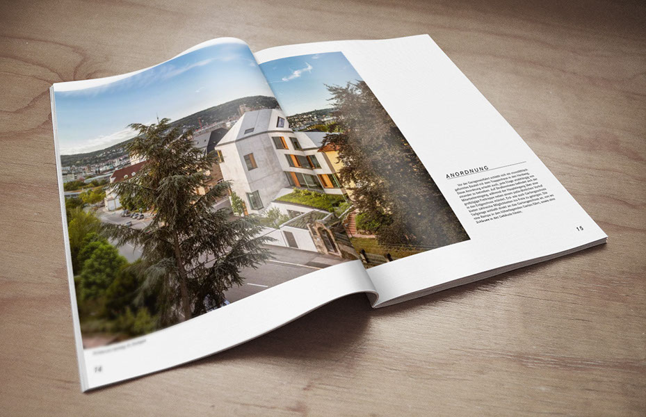 Art Direction, Konzeption und Umsetzung des Architektur Portfolios für den Büroneubau im im Herdweg in Stuttgart.